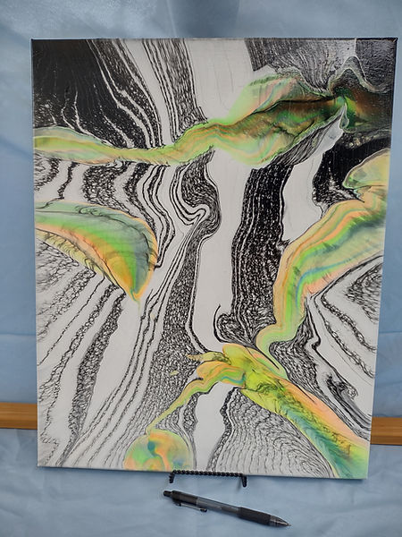 Each painting is different and carries a different energy. I name each painting based on how I perceive that energy that emanates from the canvas in front of me. I feel that because of the chaotic nature of the fluid acrylics moving on the canvas, it allows me to co-create with the quantum field of potential that surrounds us in this dimension.